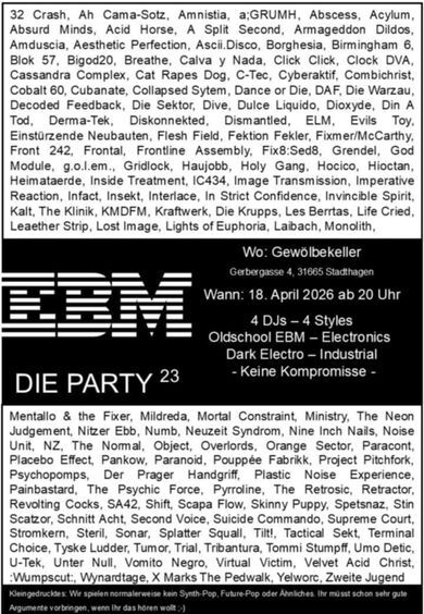 Am 18. April 2026 lädt der Gewölbekeller (Gerbergasse 4, 31665 Stadthagen) zu einem besonderen Szene-Abend ein: EBM – Die Party 23. Los geht es ab 20 Uhr mit einem kompromisslosen Mix aus elektronischen Sounds.