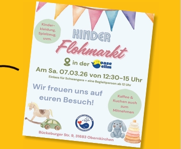 Am Samstag, 07.03.2026, findet von 12:30 bis 15:00 Uhr ein Kinder-Flohmarkt statt. Schwangere erhalten bereits ab 12:00 Uhr gemeinsam mit einer Begleitperson Einlass.