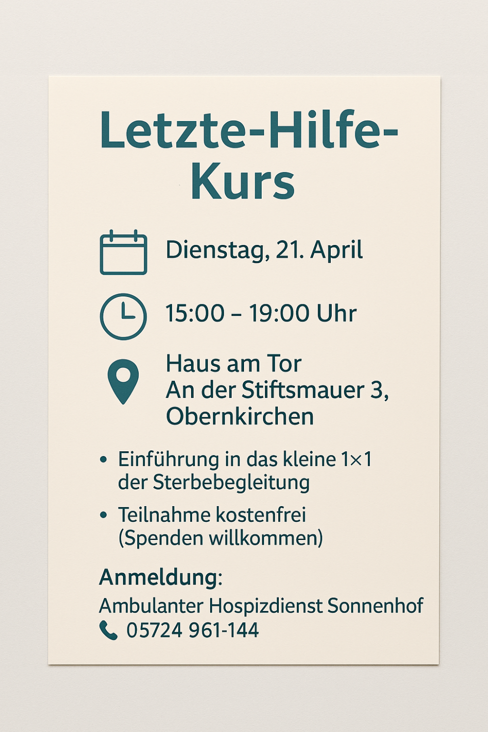 Anmelden kannst du dich beim Ambulanten Hospizdienst Sonnenhof Obernkirchen, Auetal und Umgebung unter der Telefonnummer (05724) 961‑144. Die Teilnahme ist kostenfrei, eine Spende für die Hospizarbeit ist jedoch willkommen.