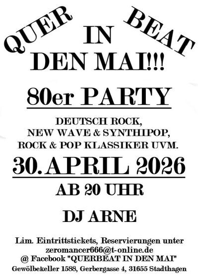Am 30. April 2026 heißt es im Gewölbekeller1588 wieder: „QUERBEAT IN DEN MAI!!!“ – eine große 80er Party, die euch musikalisch zurück in eines der prägendsten Jahrzehnte der Musikgeschichte entführt. Ab 20 Uhr erwartet euch eine stimmungsvolle Nacht voller Klassiker und Kult-Hits.